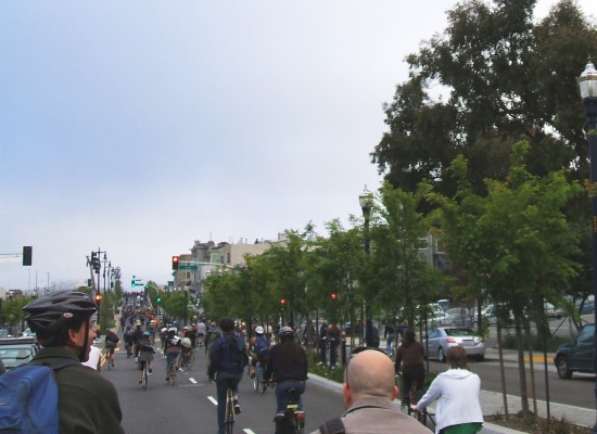 The design features two narrow streets alongside the big open boulevard in the middle. The idea is that the narrow streets will be safe for pedestrians and bicyclists, while the cars have at it in the middle part. Unfortunately, the middle is a bit too wide open for my tastes, and while it's beautiful (and safer) when Critical Mass is on it, it's got a problem with leadfoot motorists. They see a big road and hit the gas, especially after getting up and over the crest of a hill, which gives them a wide-open vista down to a freeway onramp.