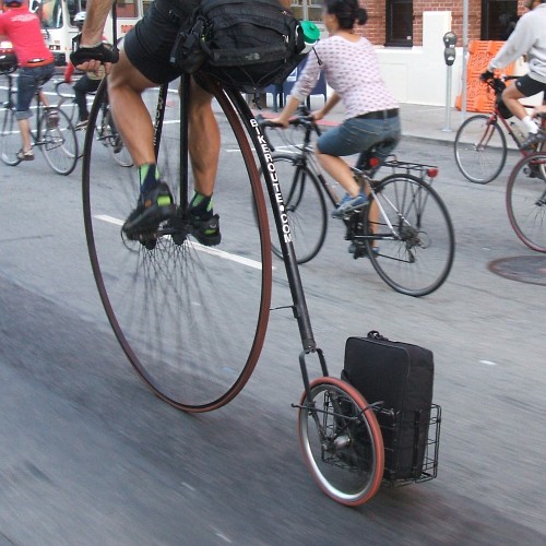 As we turned onto 2nd St. I saw Martin Krieg on his penny-farthing bike, which had a folding basket attached to its smaller (farthing) wheel. The basket appeared to be carrying a laptop, and the bike had BIKEROUTE.COM painted on the frame. Not something you'd see every day in the 1870s. An out-of-the-ordinary ordinary. | ![]() |