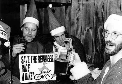 (left to right) Chris Carlsson, Jim Swanson, and Glenn Bachmann enjoy a pitcher and a bit more at Zeitgeist after the December 1992 Critical Mass in San Francisco. They had been Santas chanting "Save the Reindeer, Ride a Bike!"